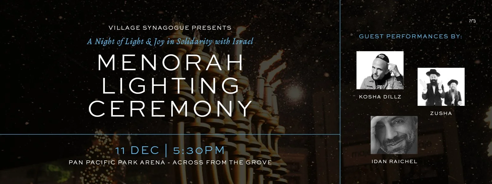 The Menorah Lighting ceremony hosted by Village Synagogue brings thousands of Jews together for a star-studded night of light and joy in celebration of the holiday of Chanukah. Guests enjoy giveaways, celebrity appearances and Chanukah Treats and surprises.